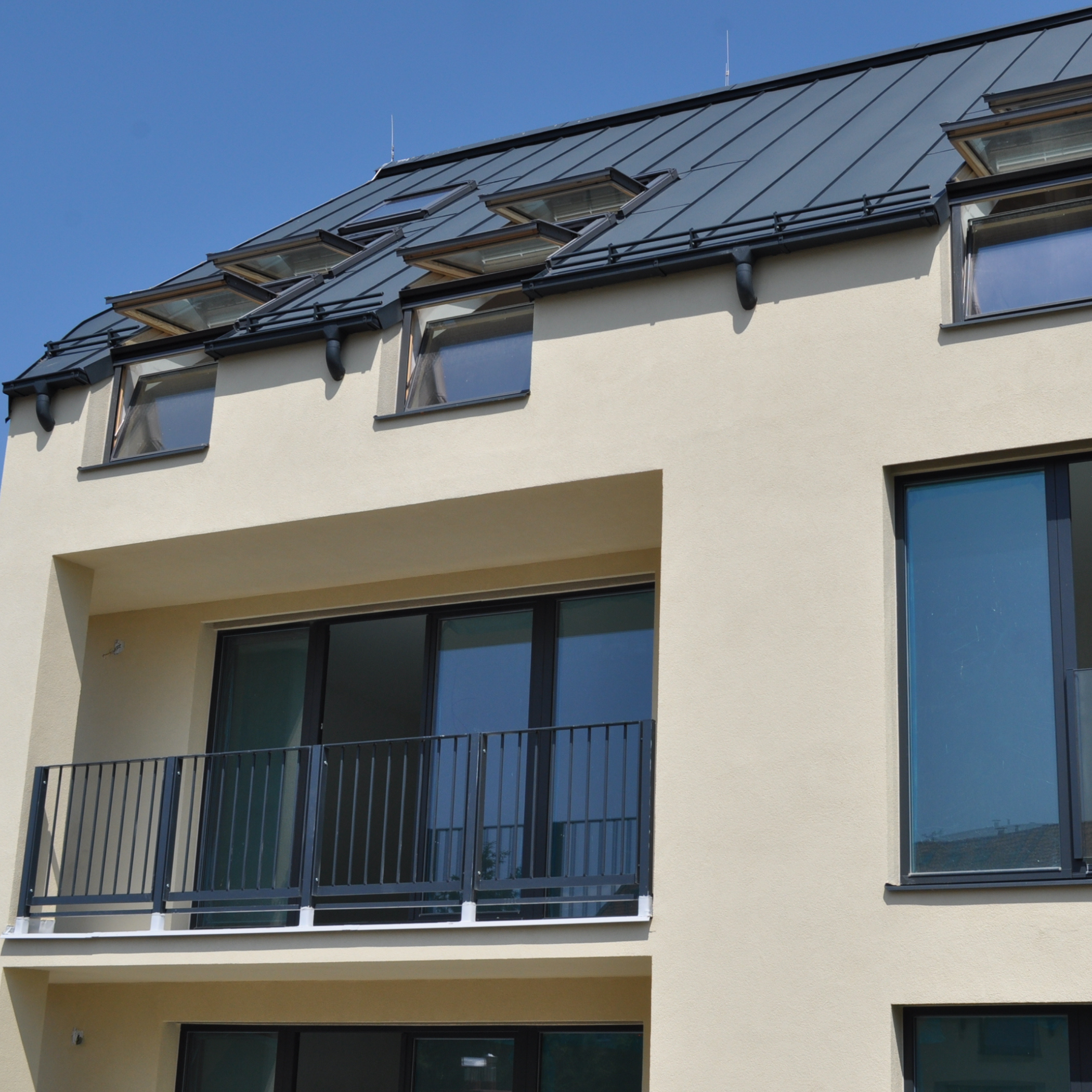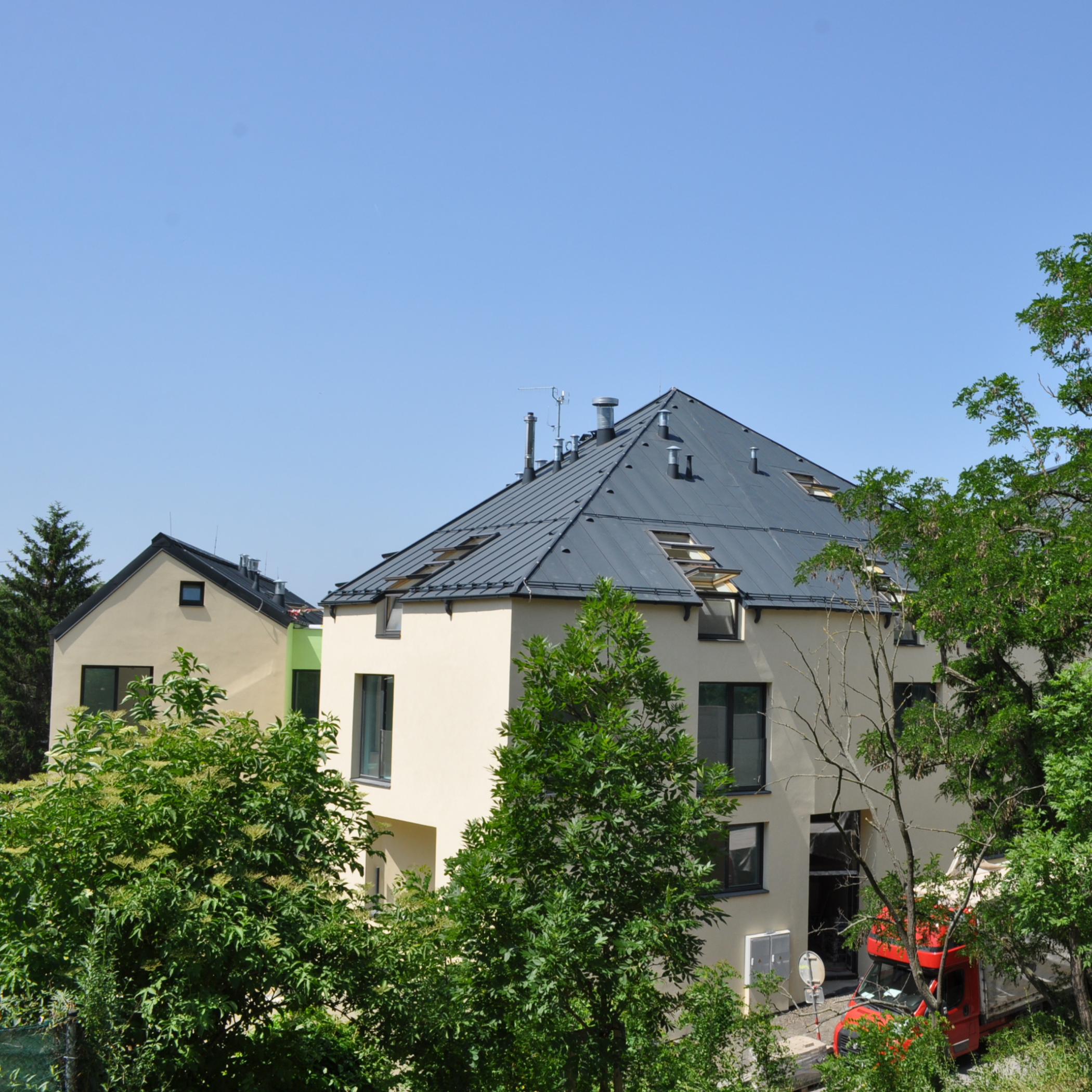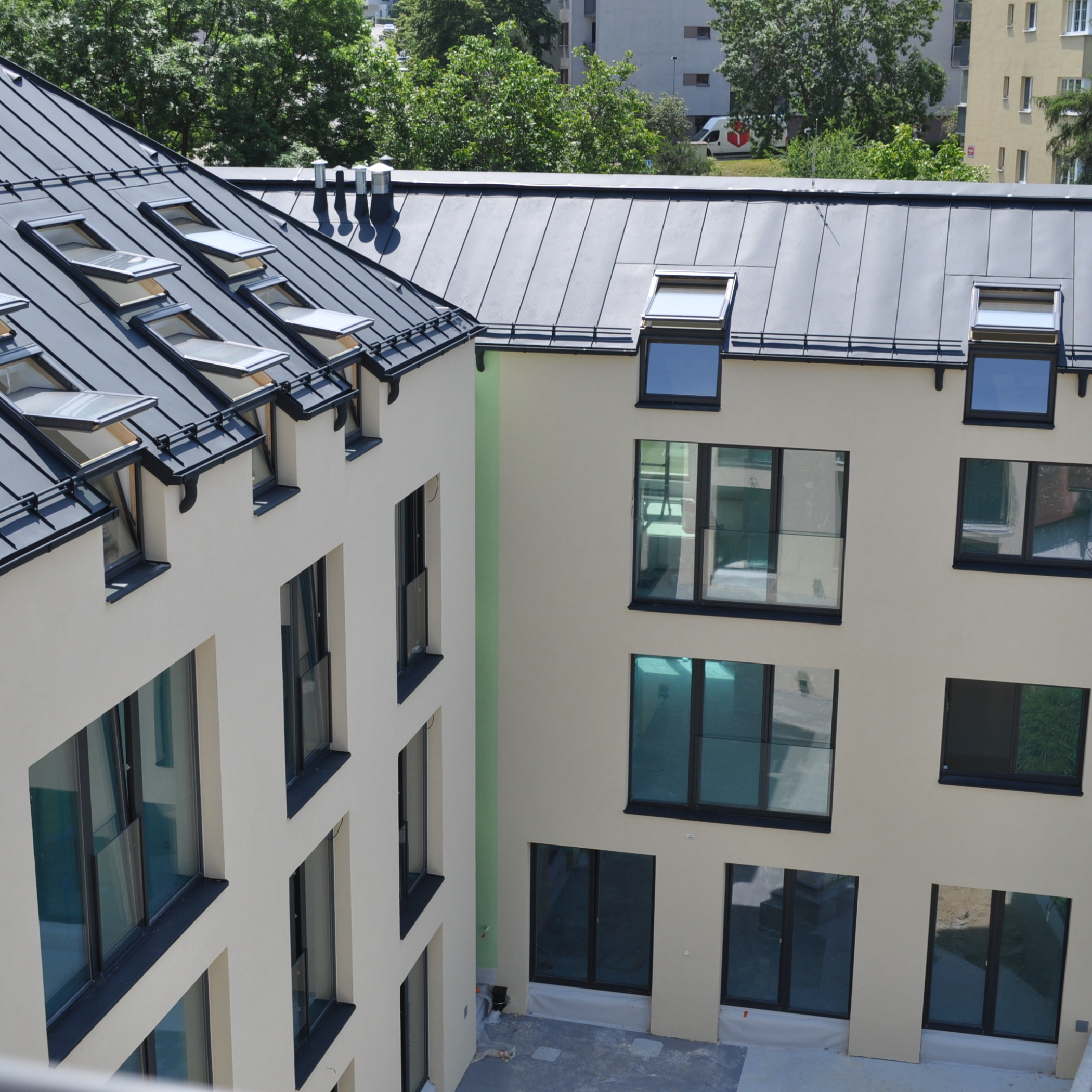 Komplex tvoří tři propojené domy, které přirozeně zapadají do okolní zástavby. Nabízí 34 bytů, pohodlné parkování ve dvoupodlažních podzemních garážích a odolnou falcovanou střechu z titanzinku, která podtrhuje architekturu a zajistí dlouhodobě bezúdržbový provoz.